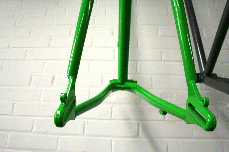 Mike came to us looking for an S&S coupled ride that could go anywhere he wanted to with ease. His bike also features the Paragon sliding dropouts, a braze-on Geekhouse logo. Brad did a great job powder coating it this candy-apple green, too!